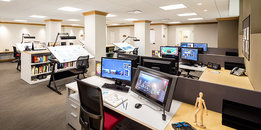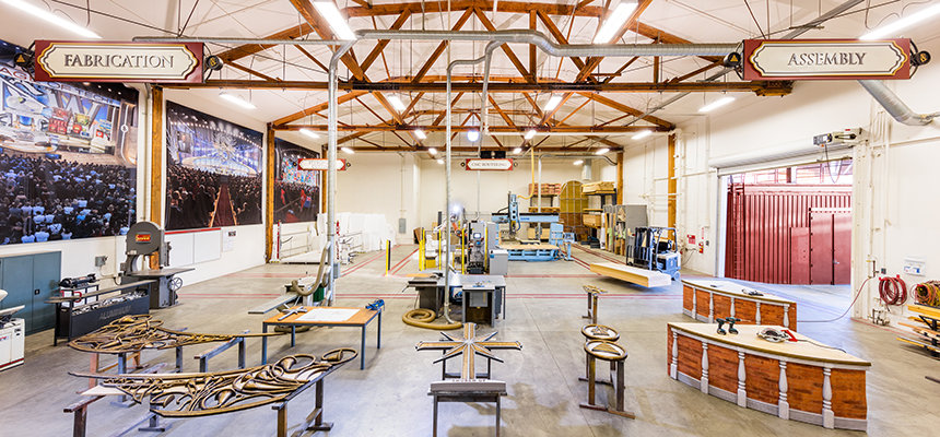 A létesítmény egyik korábbi filmstúdiójában berendezett díszletműhely fel van szerelve a legújabb csúcsmodern gépekkel a 3D-s jelenetek és díszletek felépítéséhez.