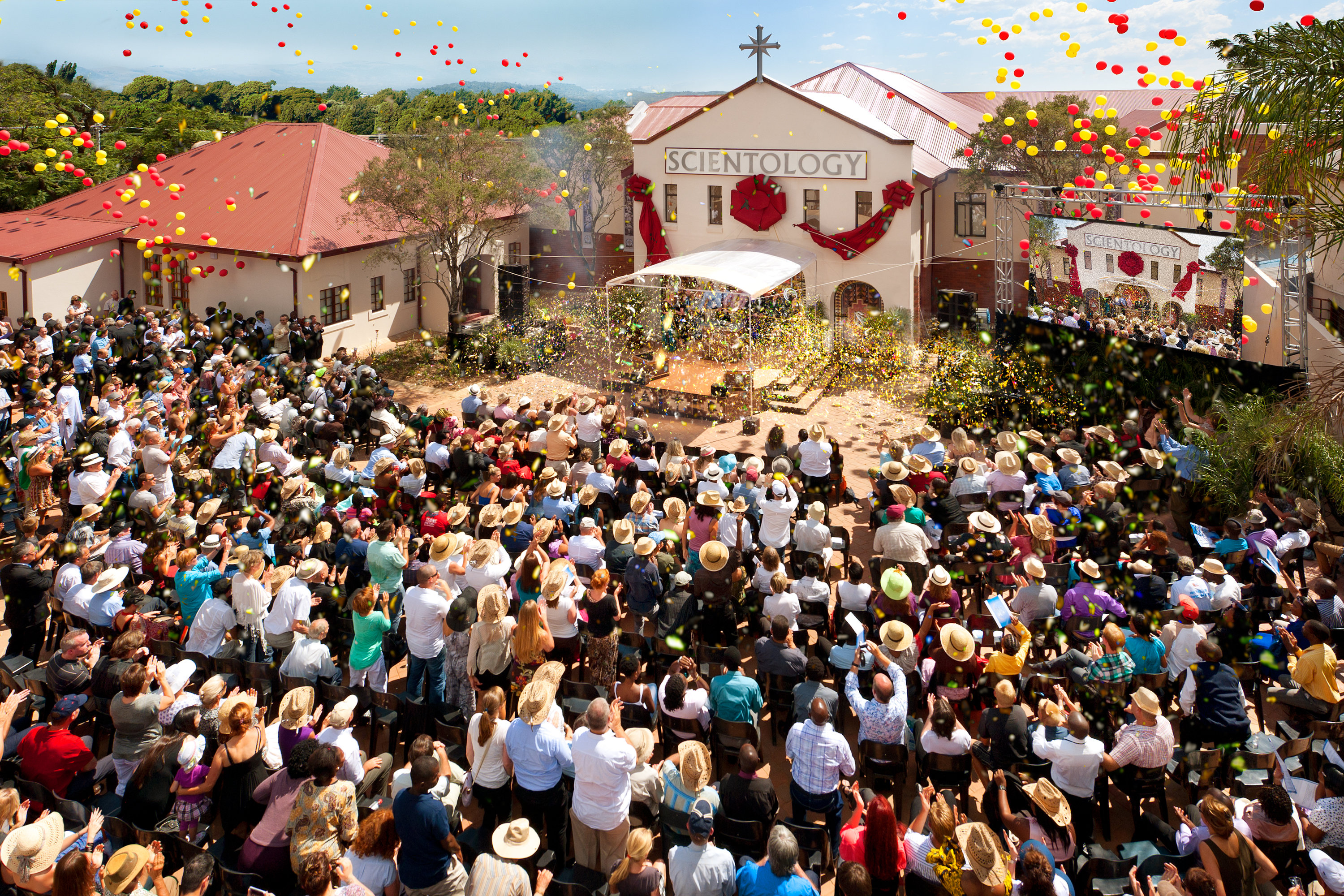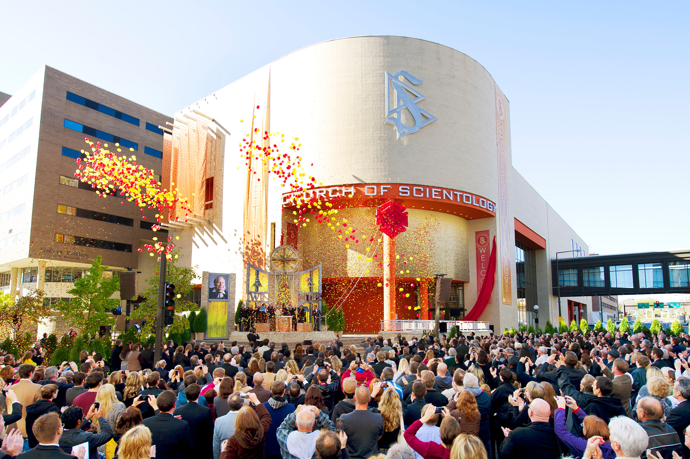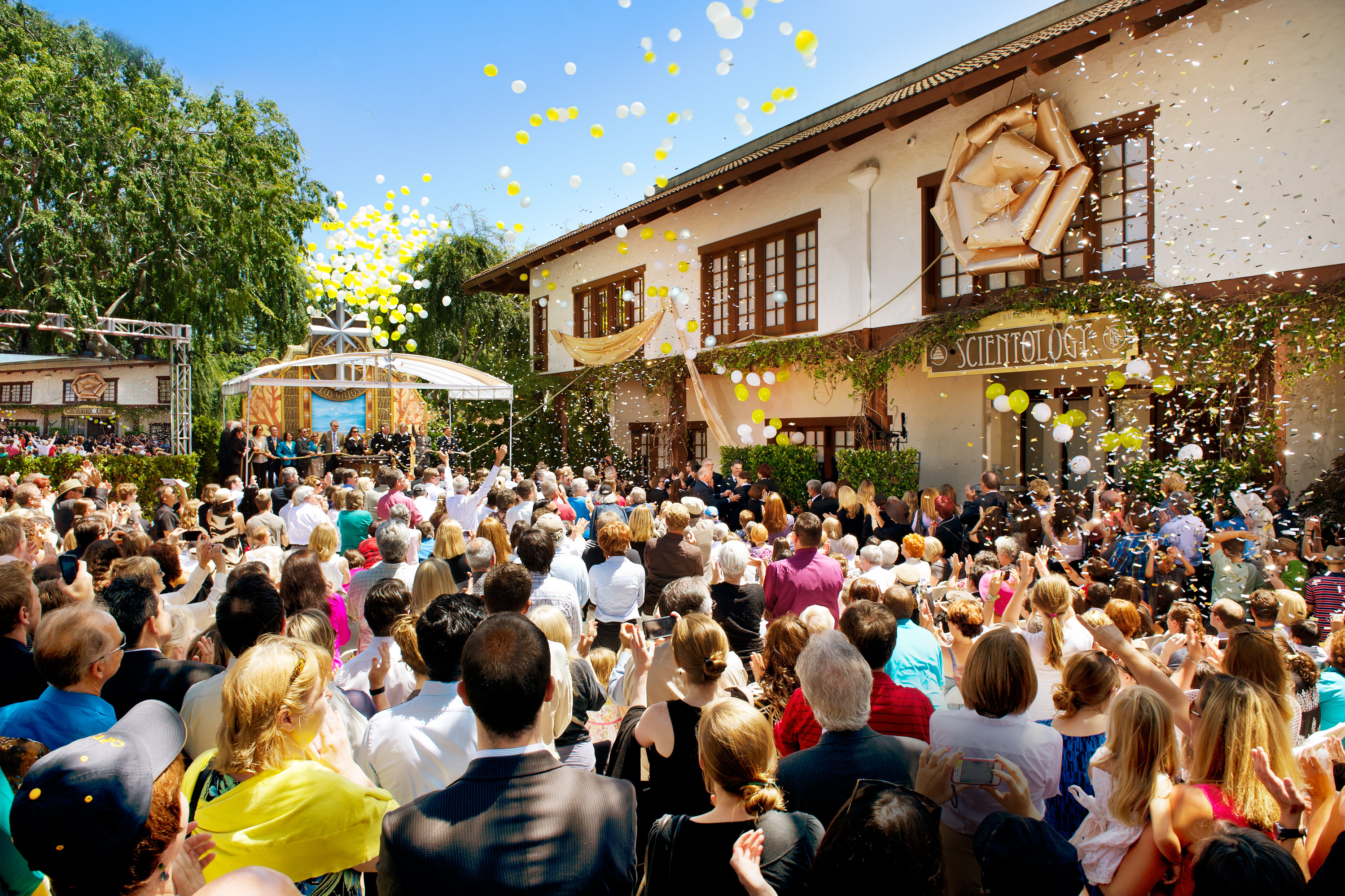 Egy ragyogó őszi napon Scientologistok és vendégek gyülekeznek a város Crossroads művészeti negyedében, hogy megünnepeljék a fenséges, új Scientology egyházat.