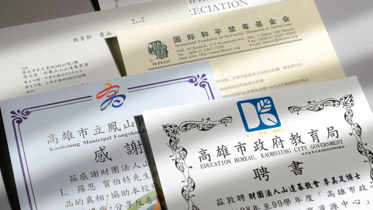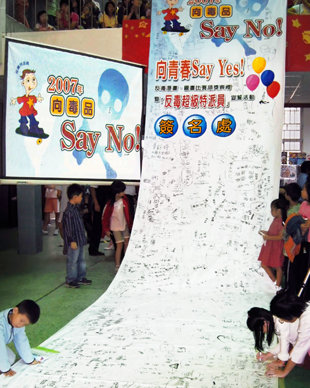 A Drogmentes Világért Alapítvány tajvani irodája az egyik legaktívabb a világon: 1,1 millió embert értek el 3400 felvilágosító rendezvényen; 700 000 füzetet osztottak ki; 750 iskolában 267 000 tanuló vett részt előadásokon; a társadalmi célú hirdetéseket pedig 50 tévéállomáson sugározták több százezer nézőnek. A partnerek és támogatók közé tartoznak városi tanács tagjai, törvényhozók, rendőrségi vezetők, polgármesterek, az Oktatási Minisztérium és olyan civil szervezetek, mint például az Ópiumtermelés Békés Eltörlése Nemzetközi Alapítvány.