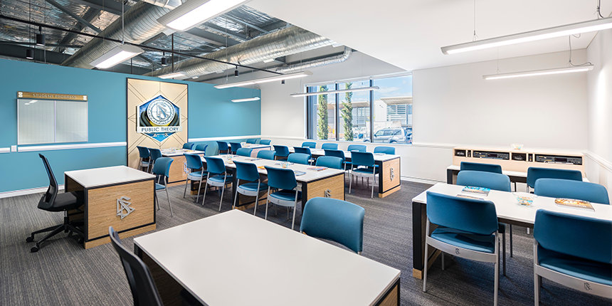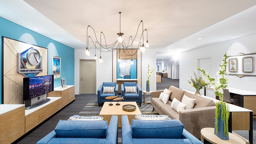Az új Perthi Scientology-egyházhoz közelítőket először az épület látványos homlokzata köszönti. Ahogy a hívők belépnek a tágas térbe, a recepción először a Közönséginformációs Központ látványa fogadja őket. A tér teljesen nyílt, magas menyezettel és ipari stílusú világítással. A letisztult vonalak és a meleg hangulatú rusztikus famunka mellett sötét fémes hangsúlyozó elemek adnak modern ipari légkört az egész térnek.