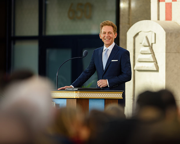 David Miscavige, a Religious Technology Center Vezetőtestületének Elnöke üdvözölte a lelkes tömeget a szalag átvágása előtt. „Ma ez az örök második város valóban az élre került – mondta David Miscavige. – Mielőtt a Szeles város szalagja aláhullna, ez az a pillanat, hogy elismerjük azt, amit már tudtok: éppúgy, ahogy Chicago egykor újjászületett, ma is van még hely egy új kezdet számára. Így aztán van még hely, ahol az egyén számára helyre lehet állítani azt a képességet, hogy a saját megítélése szerint – és a társaival – jobb életet éljen, és hogy jobb játszmát játsszon.”