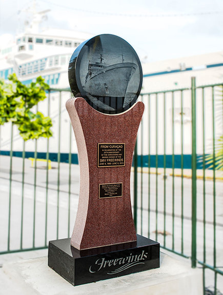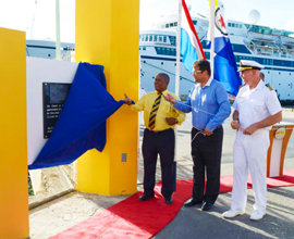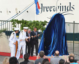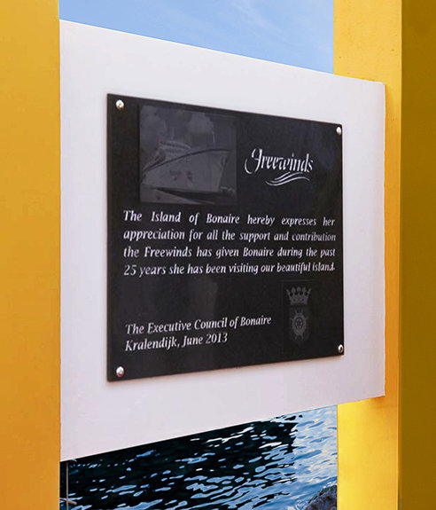 - Egy emléktábla Willemstad (Curaçao fővárosa ) kikötőjében – a Freewinds anyakikötőjében. A miniszterelnök maga avatta fel a táblát, amely a hajó állandó kikötőhelyét ismeri el a szigeten.