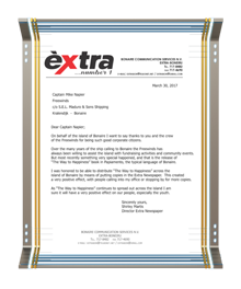 Ott volt a spanyol hajópincér, aki elmondta: „jobb emberré váltam, aki törődik az embertársaival, és mindez Ronnak köszönhető.” Hasonlóképpen, a portugál vállalkozóhoz, aki arról beszélt, hogy micsoda „erőt sugároz” LRH, amely „azzá tette az életemet, aki ma vagyok”. Őt követte a karibi zsinagóga elnöke, aki elmondta L. Ron Hubbardról, hogy „megörökítette az új világ legrégebbi zsinagógájának hangulatát és légkörét” a nagy becsben tartott képes hírújságukban. És végül, íme a sziget rádiós személyisége és építésze, aki úgy emlékszik L. Ron Hubbard kapitányra, mint aki arra ösztönözte a karibi évfolyamtársait, hogy vértezzék fel magukat az oktatáson keresztül, és akit ezért úgy hívott „a Kapitány, aki számomra nem csupán egy hajó kapitánya, hanem aki az életünk alakulását is a helyes irányba tereli.”
