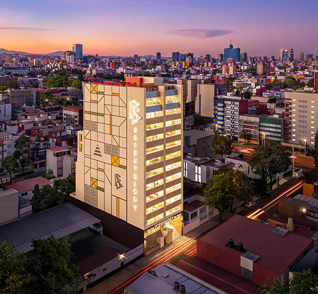 ÉLJEN MEXIKÓ 12 emelettel magasodik Mexikóváros egyik legélénkebb kulturális élettel rendelkező területe fölé a jövőbeli Scientology Egyház Del Valle mint a szellemi szabadság világítótornya. A 24 méter magas felirat minden irányból kilométerekre látszik.