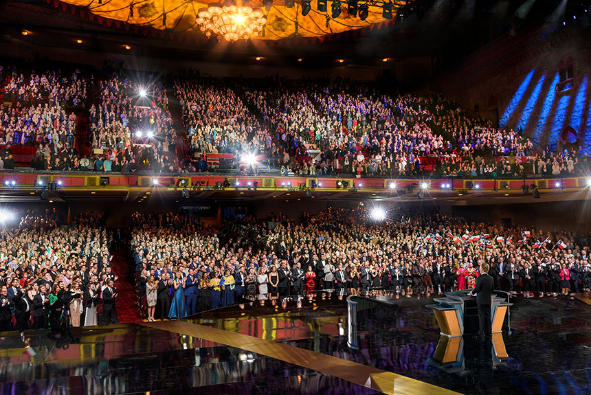 A nagyszerű Los Angeles-i Shrine Auditorium adja a telt házas hátteret a több mint 6500 Scientologistból és vendégből álló közönség számára, akik összegyűltek a Scientology Egyház látványos újévi ünnepségére.